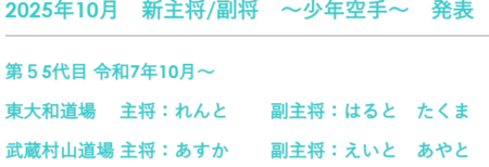 【歴代主将・副主将一覧】 第55代目 令和7年10月~ 東大和道場 主将:れんと 副主将:はると たくま 武蔵村山道場 主将:あすか 副主将:えいと あやと (個人情報の観点から名前のみ記載に変更、道場ではフルネームで記載) 第54代目 令和7年7月~ 東大和道場 主将:あさひ 副主将:はれん れんせい 武蔵村山道場 主将:れん 副主将:はる てつや 第53代目 令和7年2月~ 東大和道場 主将: いちと 副主将:ゆうや いぶき のぼる 武蔵村山道場 主将: あさひ 副主将:あすか しゅう 第52代目 令和6年10月~ 東大和道場 主将: ゆうき あいみ 副主将:はると めぐる 武蔵村山道場 主将: ひ…