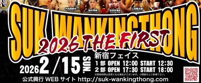 2026年2月15日(日)SUK WANKINGTHONG 福僚太選手出場開催日: 2026-01-18カテゴリー: 行事/試合/興行の予定 2月15日(日)SUK WANKINGTHONG 福僚太選手出場 場所 新宿FACE 福選手の応援をお願いします